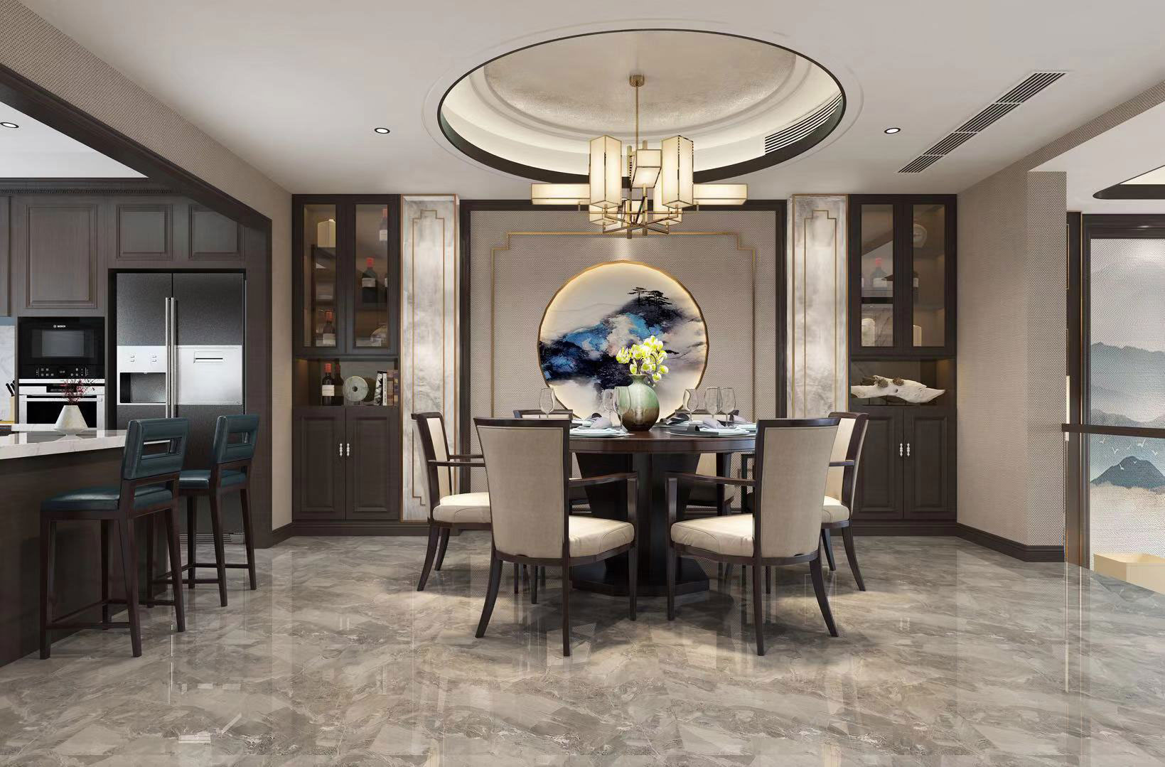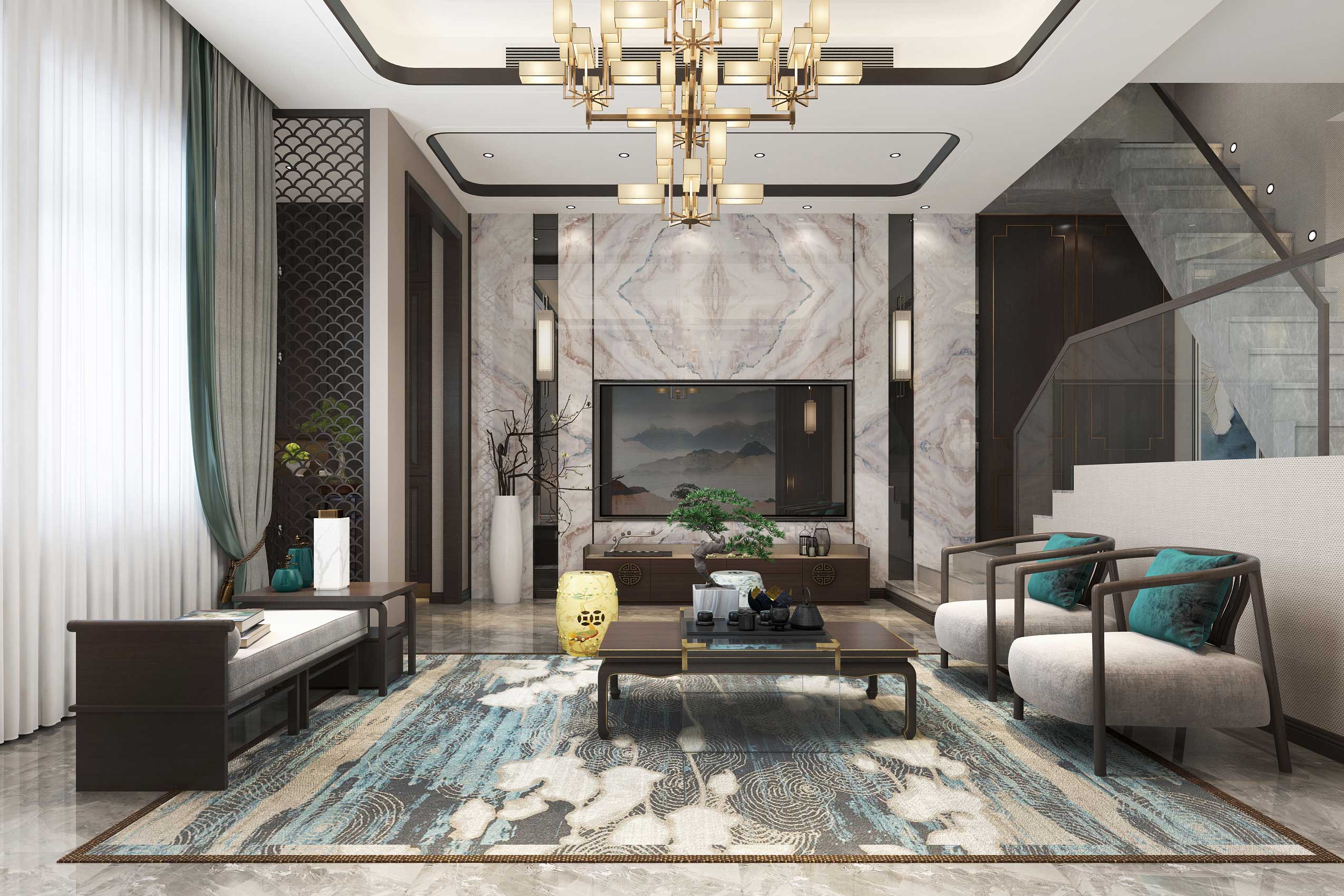 本案特點:品一杯茗茶,守一方凈土。中式傳統(tǒng)結(jié)構(gòu)結(jié)合現(xiàn)代審美,凸顯不一樣的品質(zhì)格調(diào)。藍色的融入,使整個空間大而不空,厚而不重。原木家具、瓷磚、鏤空隔斷等讓空間更具層次感,金屬線條的碰撞,讓空間結(jié)構(gòu)更加大氣莊重。