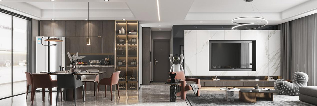 本案是極簡黑白灰,不管是色調(diào)還是設(shè)計(jì)都從極簡出發(fā),包括客廳及餐廳的燈,考斯的大玩偶擺件和可愛的座椅暗藏了業(yè)主的童趣