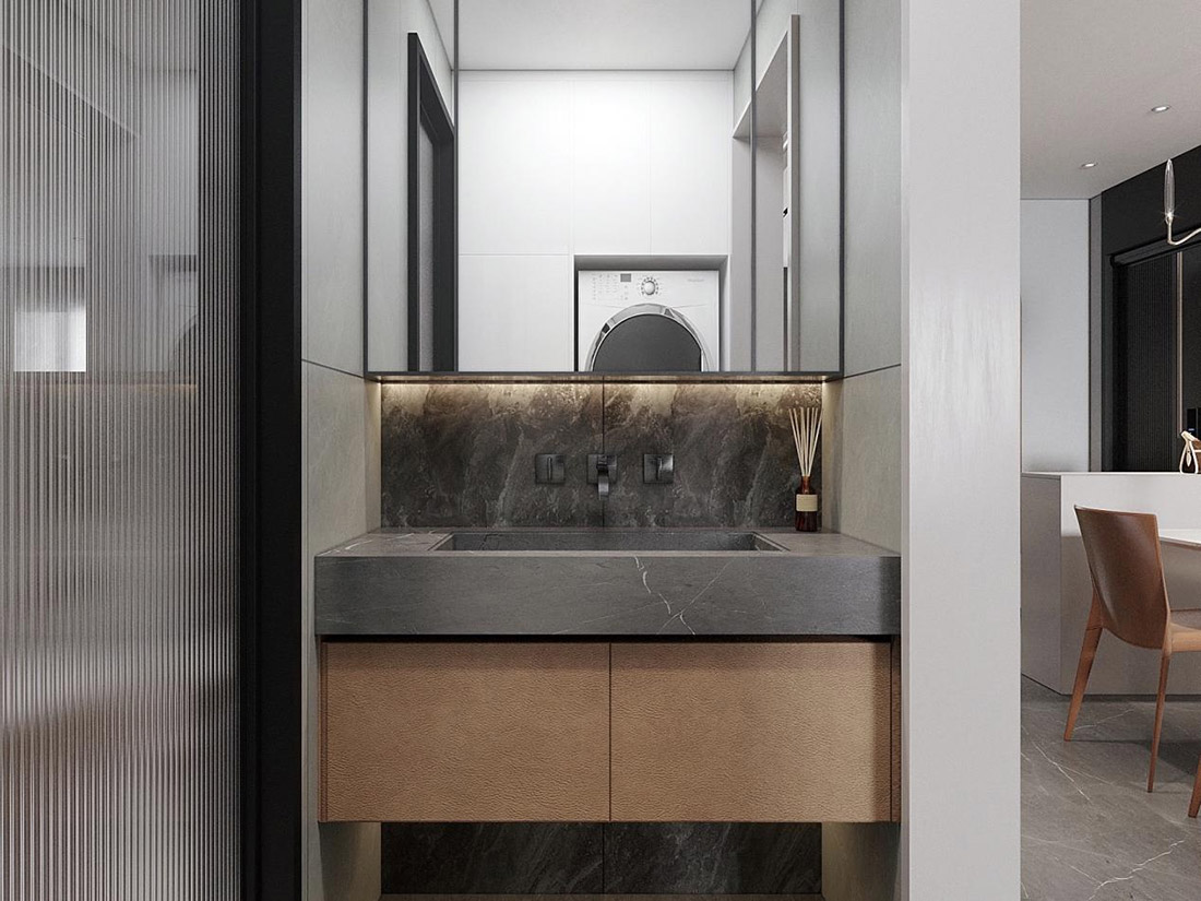 干濕分離的衛(wèi)生間,浴室柜的巖板臺面大大提升了質(zhì)感