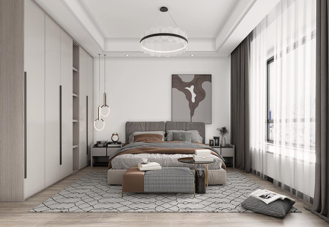 次臥整體色調(diào)是淺灰色的,讓人感覺舒緩寧靜,包括床品的顏色和窗簾以及床頭柜,透明的燈,都是符合了黑白灰設(shè)計(jì)