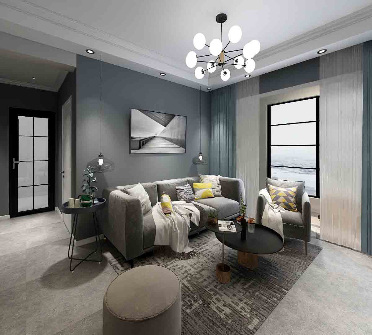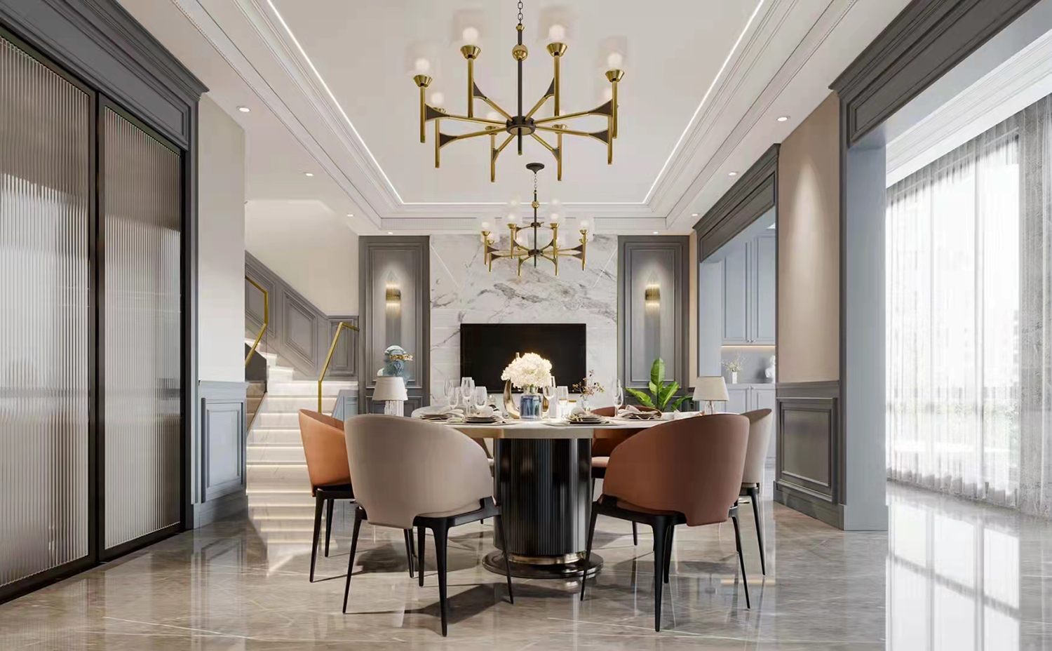 本案特點(diǎn):色彩搭配是本案中的亮點(diǎn),各種深淺的藍(lán)、渲染出獨(dú)特而濃郁的藝術(shù)氣質(zhì)。線條感家具和造型豐富的燈具,幾筆便勾勒出復(fù)古美式的摩登與簡(jiǎn)潔,令空間充滿縱向延伸的遐想。美式的皮質(zhì)沙發(fā),單椅的造型,使藝術(shù)的躍動(dòng)之美賦于空間之上,圍合式布局的擺放形式使空間看起來(lái)更有溫度。