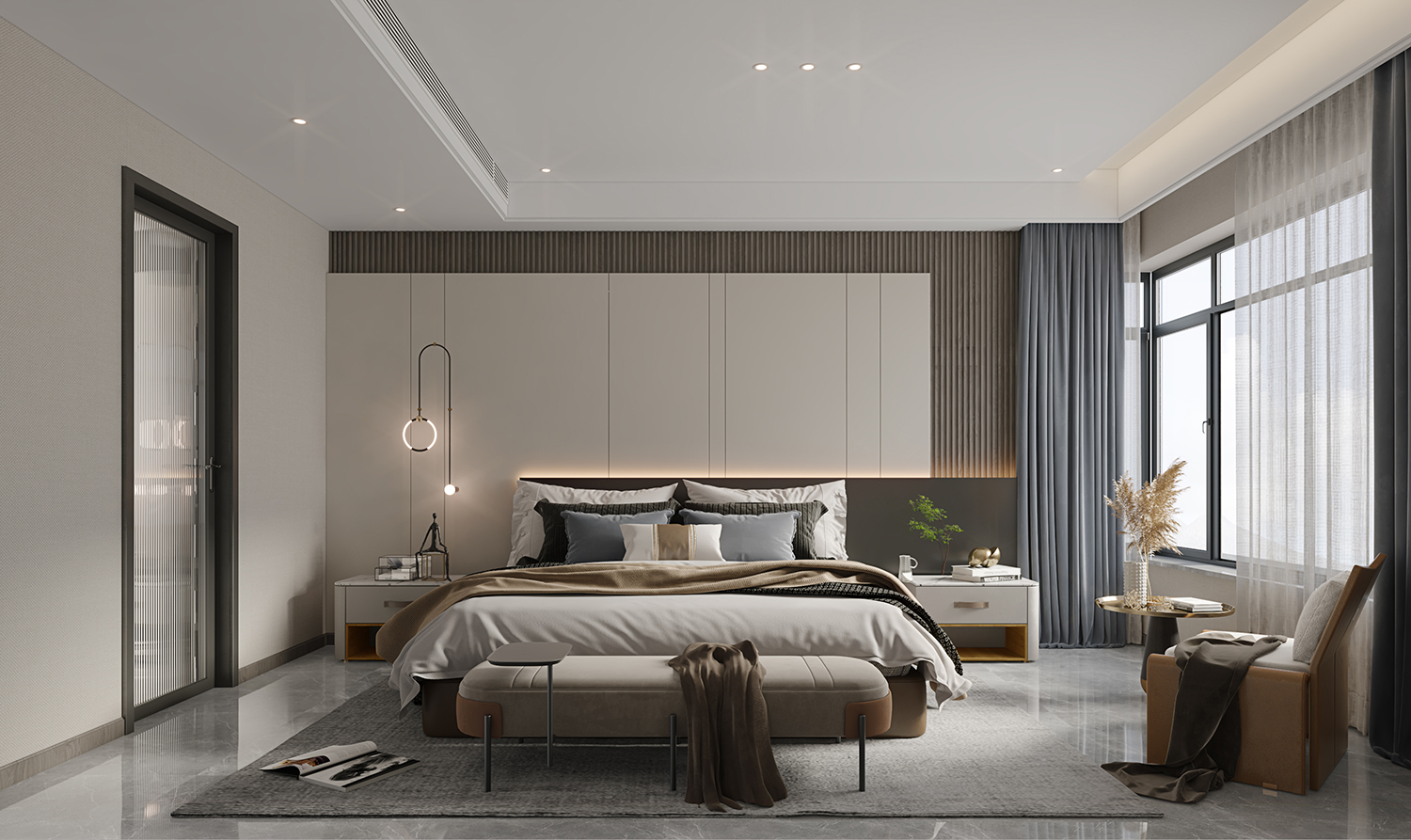 臥室的暖色調(diào),給空間帶來恰到好處的沉靜感,富有層次的無主燈設(shè)計(jì)、舒適柔軟的床品,使空間更富有生活情感。