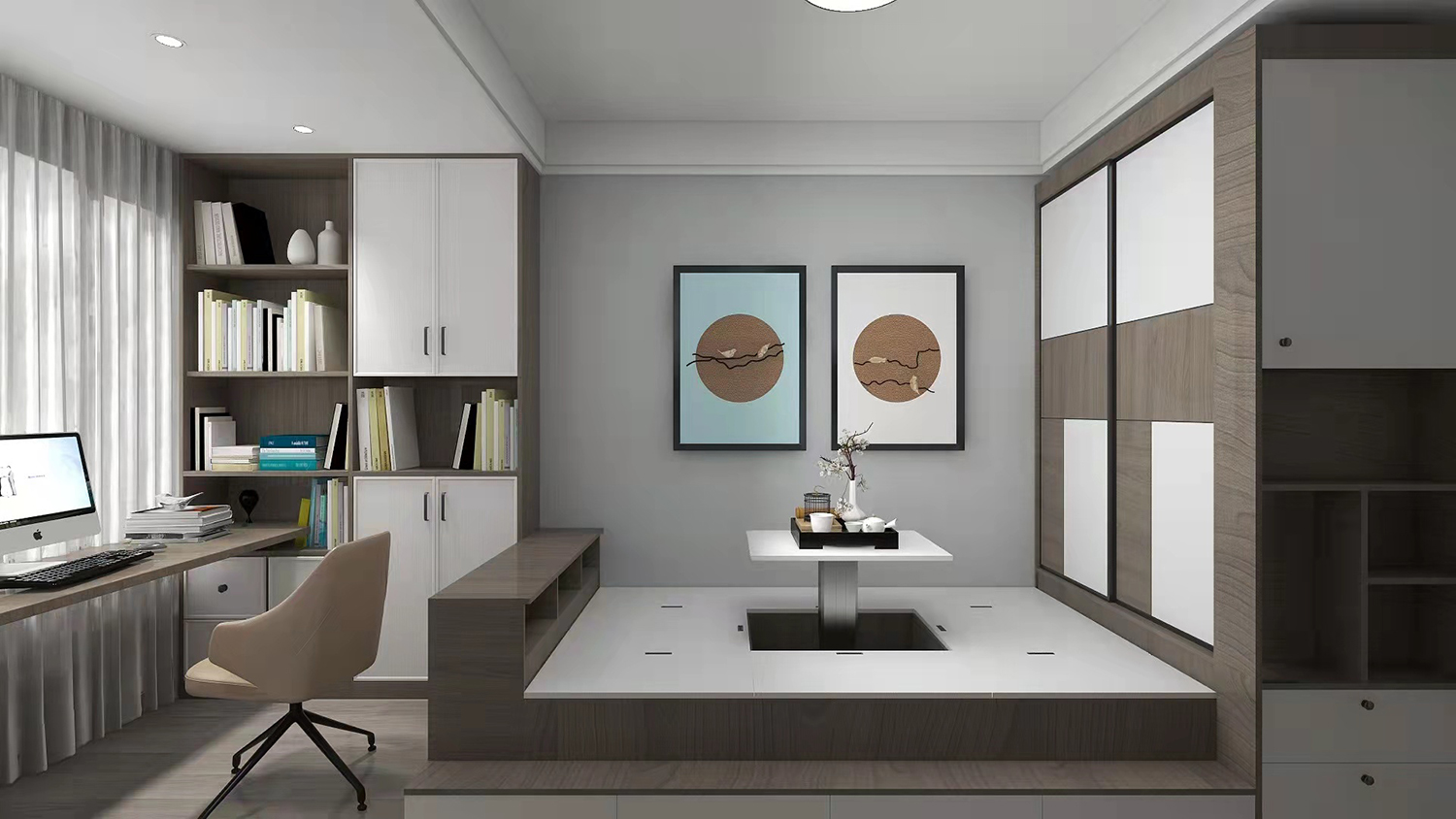設(shè)計(jì)理念:出于空間的限制以及個(gè)性化的需求,設(shè)計(jì)師融入了產(chǎn)品的思維,也滿足業(yè)主想要的獨(dú)特性。同時(shí)一并解決了主衛(wèi)跟兒童房的分隔與收納,有較高的自由度,其他區(qū)域通過(guò)高差處理,形成空間分割,層次豐富也更有趣味性。整體以冷淡的灰色調(diào)塑造寧?kù)o,淡然,優(yōu)雅的生活空間。