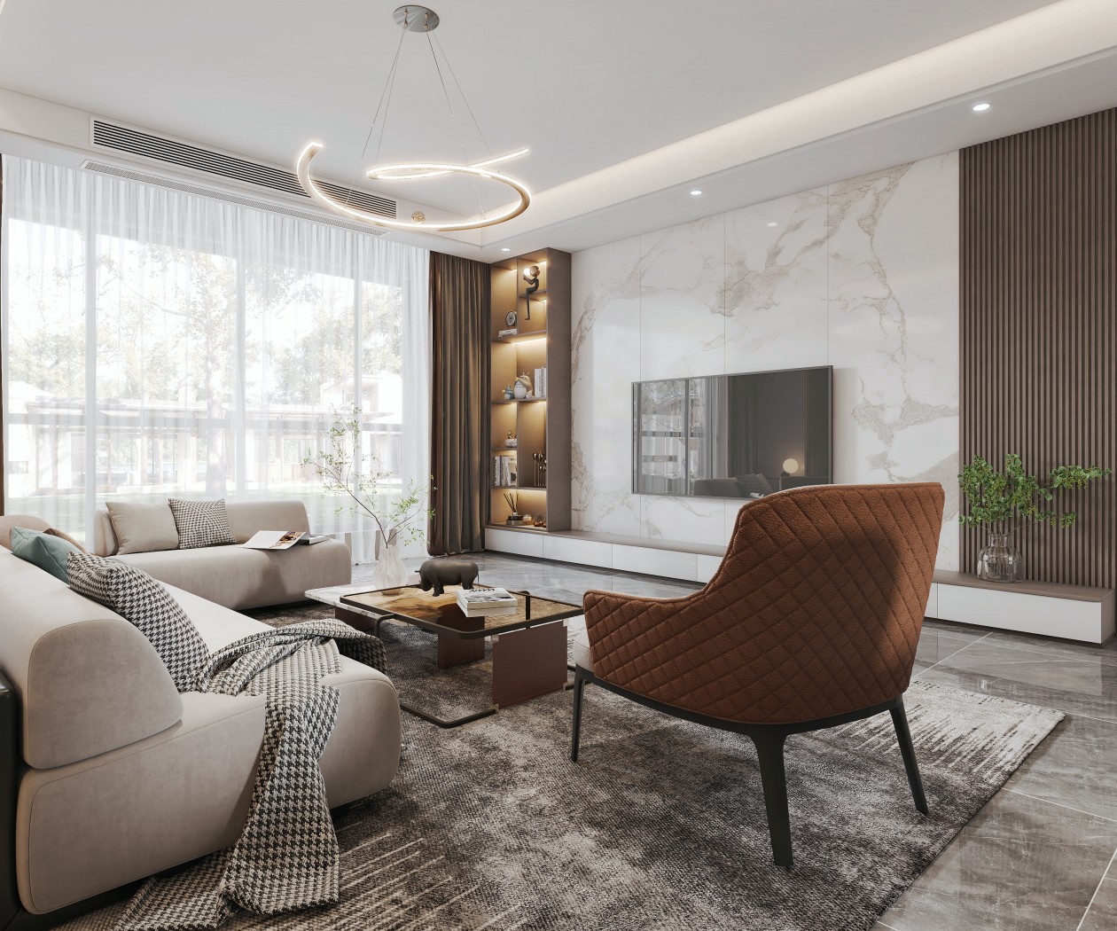電視背景墻采用了巖板連紋的造型和格柵的搭配,并且增加了一組收納墻柜,在美觀的同時增加收納空間。
