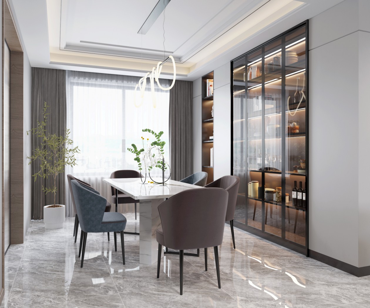 在入戶的餐廳增加了一組酒柜,以玻璃柜門加暗藏?zé)魩В怀稣故镜男Ч?,石材的餐桌臺面更和多色的皮質(zhì)座椅,是材質(zhì)和色彩的一個碰撞。