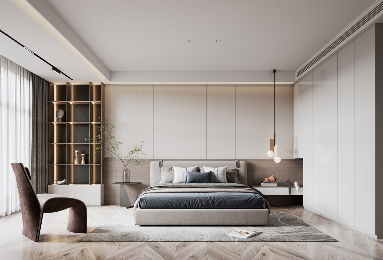 主臥延續(xù)了客廳的無主燈,墻面也是采用了護(hù)墻板,更好的連接了衣柜的接縫,讓整體房間更統(tǒng)一。