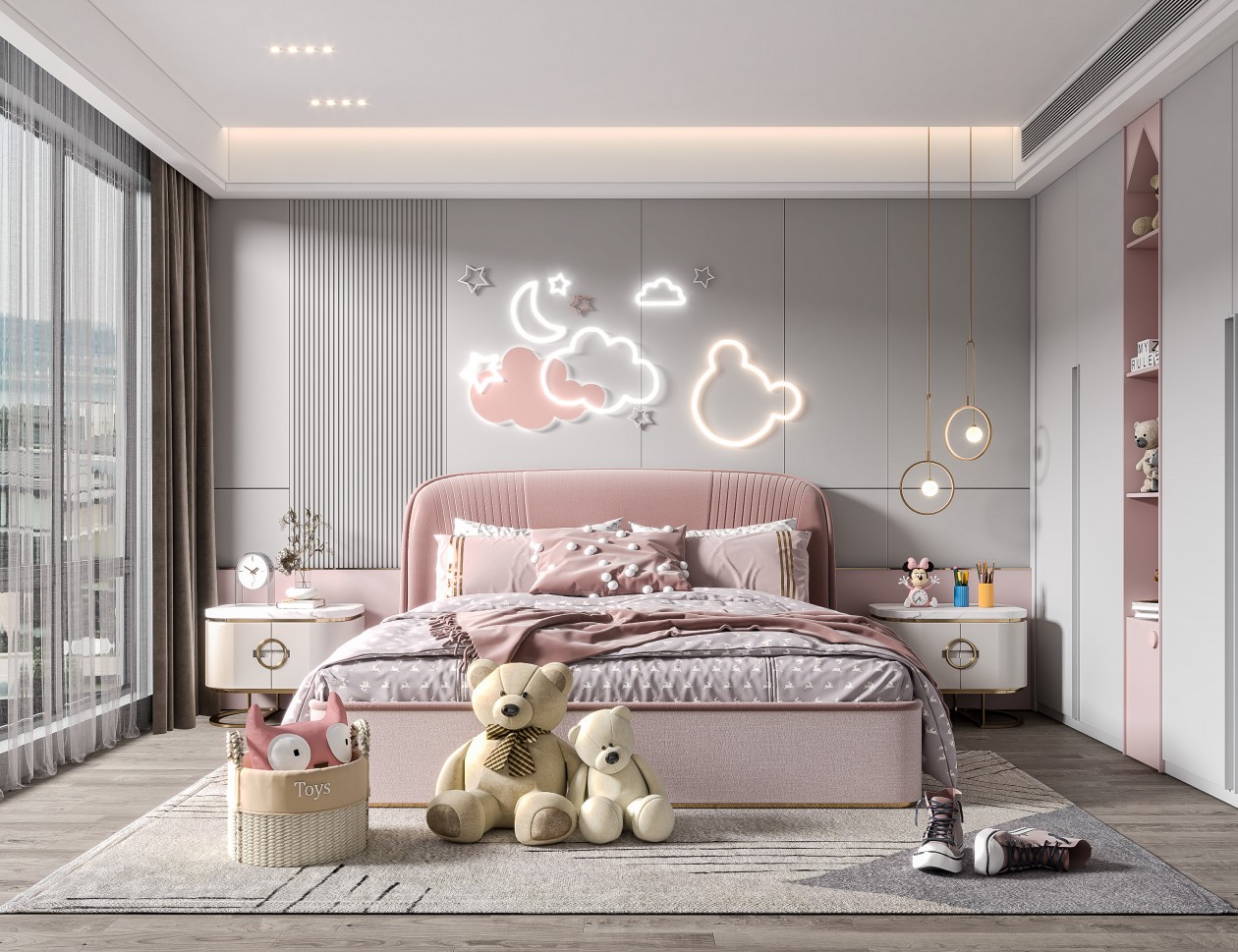 女孩房以護(hù)墻板搭配木格柵做整體造型,星星、云朵的卡通元素,讓空間多了一份可愛與甜美。