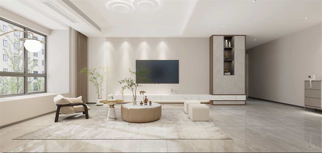 客廳的整體設(shè)計簡潔明快,呈現(xiàn)出簡而不華的視覺效果,電視背景墻采用了白色格柵的裝飾,并在此基礎(chǔ)上增加懸空電視柜,滿足物品的展品需求。