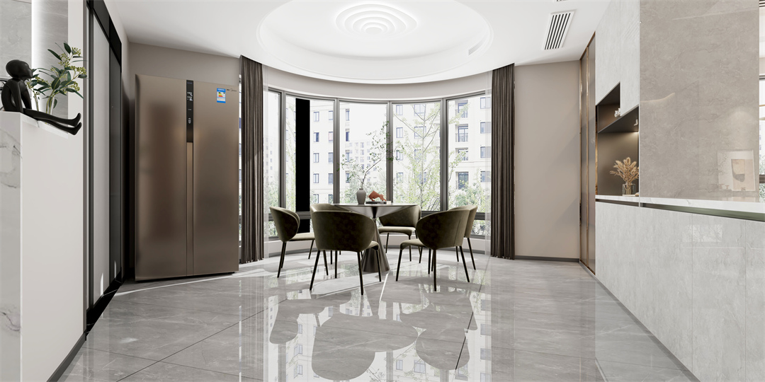 餐廳與客廳相連,讓自然光線籠罩整個室內(nèi),也讓客廳空間更加通透舒適。圓形的大理石餐桌是絕對的主角,圓角處理形成了流暢的弧線,緩和了直線條的冷硬,也避免了磕碰的概率。半開放式的餐邊柜滿足了收納需求,紅酒、潮玩、碗碟餐具……有序分列,各歸其處,彰顯著屋主的喜好和對美食的熱愛。