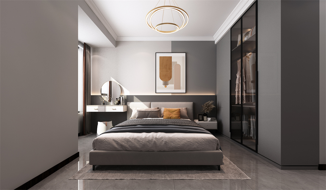 主臥以灰色為主,將梳妝臺融入,流暢梳妝動線。玻璃衣柜的設(shè)計(jì),讓空間更顯通透和質(zhì)感。