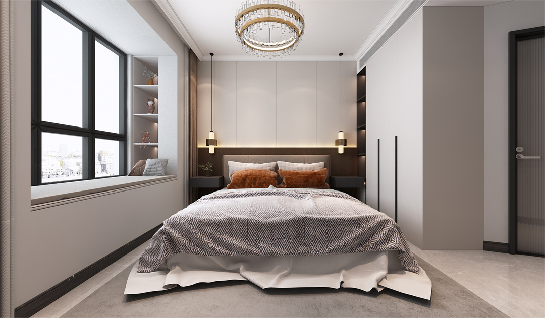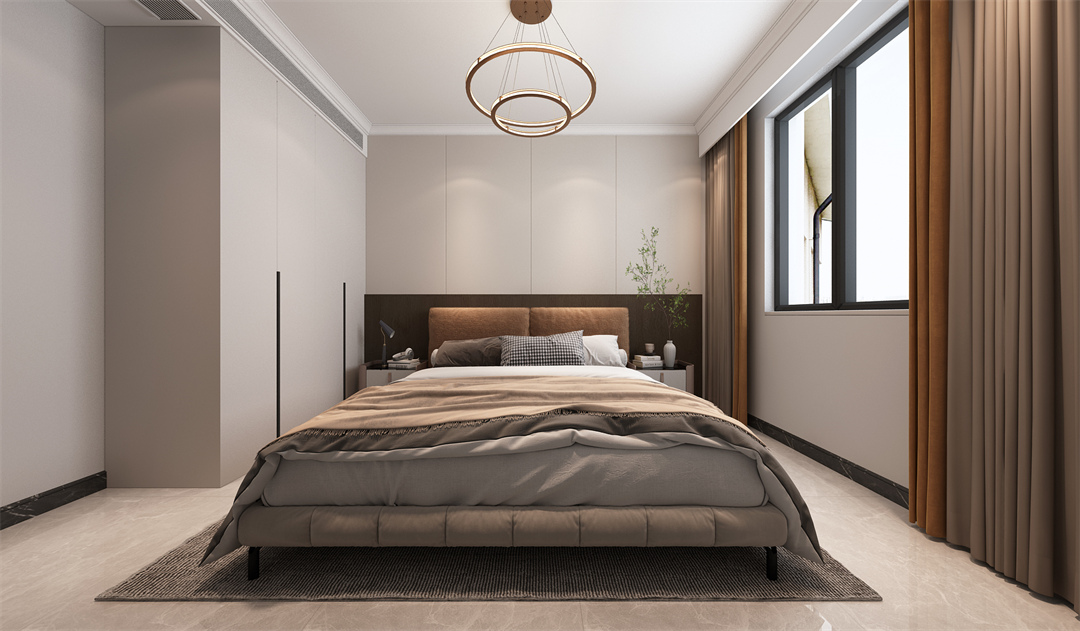 老人房利用柔和床品+窗簾等軟裝,營造溫馨的氛圍。衣柜的設計也滿足了儲物的需求。