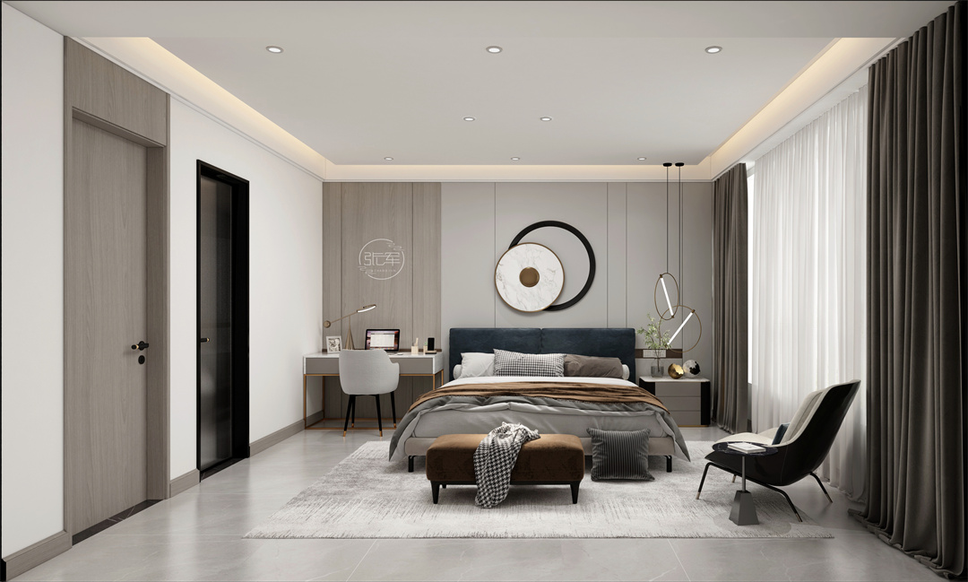 臥室雅致簡約,精巧的燈具、雅致的掛畫、軟裝配飾等,使整個居室在現(xiàn)代氣息中滲透幾許中式風韻。同時灰白顏色的運用,讓空間告別沉悶,處處散發(fā)著簡潔優(yōu)雅的層次之美。