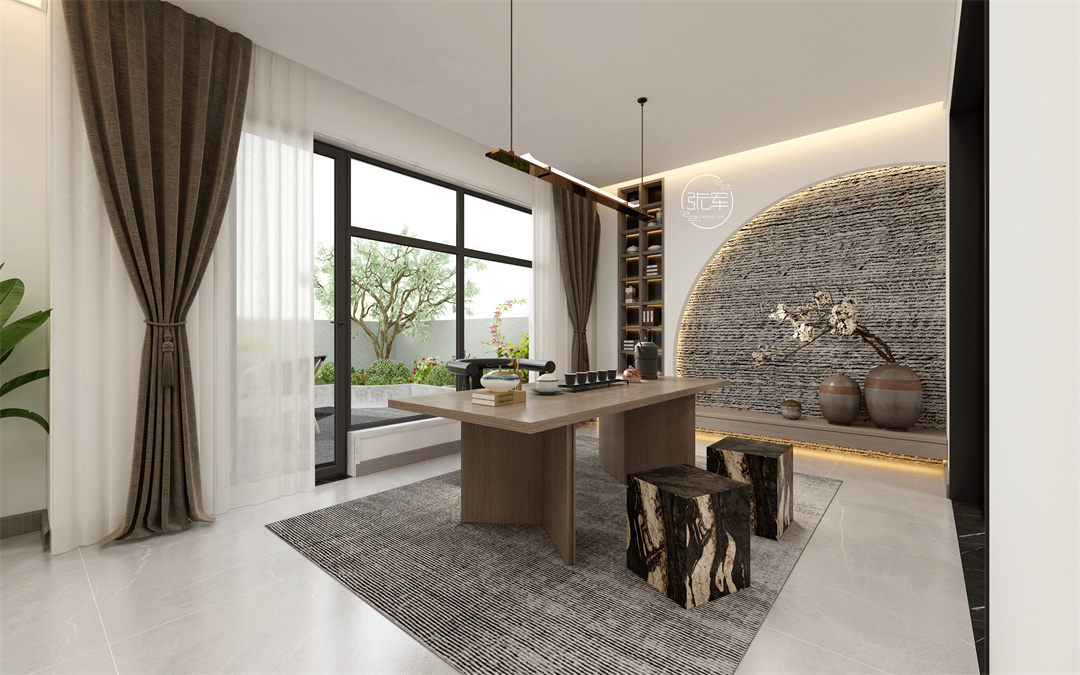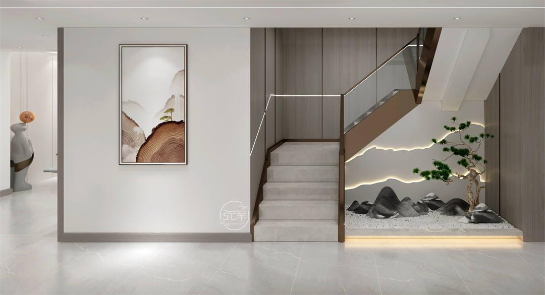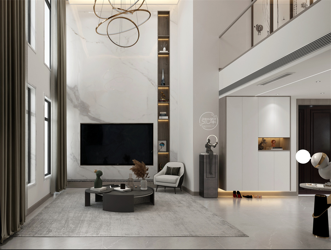 整案空間色調(diào)素凈雅致,灰白相間,黑白相生,讓空間充滿了寫意水墨的氣質(zhì)。客廳電視墻一側(cè)挑高,石材通頂,氣勢恢宏。