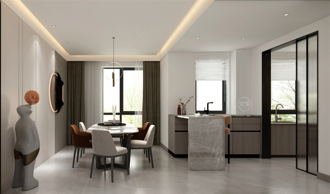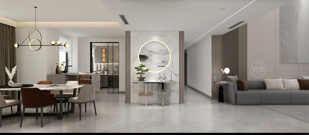 門廳以水墨畫點綴傳統(tǒng)元素,巧妙融入到設計中,與餐廳現(xiàn)代元素的吊燈相結(jié)合,讓空間兼具傳統(tǒng)與時尚。