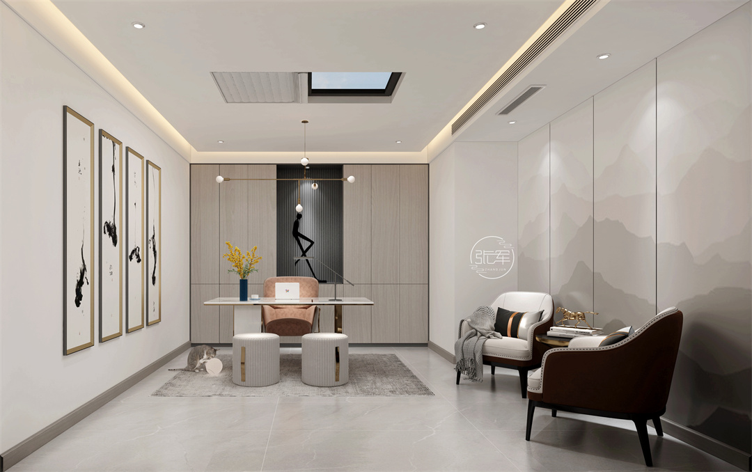 書房以留白為載體,渲染美的意境。背景墻干凈利落的線條,流暢的造型感,展現(xiàn)自然跡象的律動,讓空間美學暢意流淌。