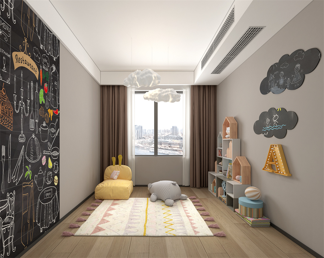 由于孩子還小,暫時將兒童房設計為親子房。這里是孩子玩耍的場所,也是童年與夢起航的地方。