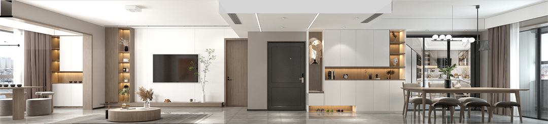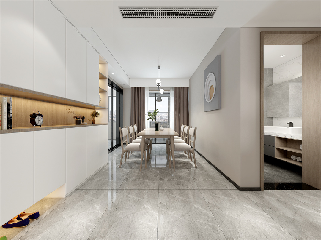 玄關(guān)聯(lián)動廚房與餐廳,一整組的玄關(guān)柜滿足家人入戶的收納需求。餐廳是六人位餐桌椅陳設,質(zhì)樸的原木色,簡潔素雅的白,安靜怡人的空間,最適合家人用餐。