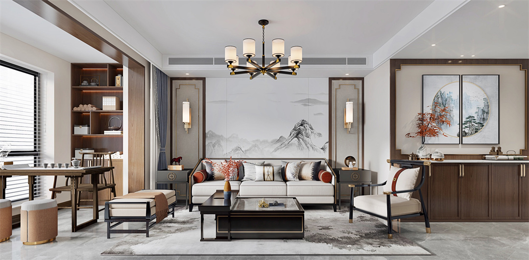 設(shè)計(jì)理念:整套案例定義為新中式風(fēng)格,更傾向于簡(jiǎn)約意境的東方之美,設(shè)計(jì)師借由克制內(nèi)放手法,完成現(xiàn)代與詩(shī)意的空間敘事。整個(gè)空間具有很好的連貫性,客餐廳的貫穿,功能多位一體化,于和諧中穿插著變化與層次。