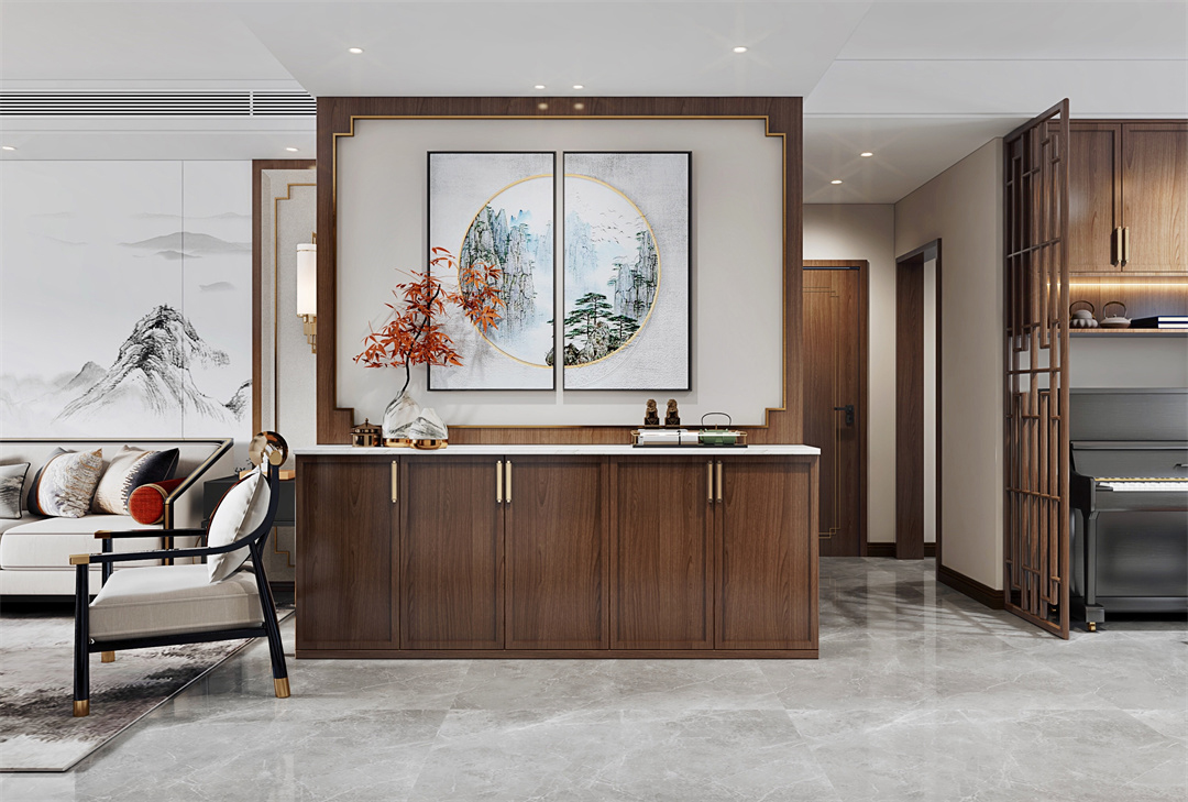 入戶(hù)門(mén)廳處,玄關(guān)和鞋柜相結(jié)合,一幅中式元素的掛畫(huà)展現(xiàn)了天圓地方的自然灑脫,搭配簡(jiǎn)化后的四角回形紋,完美詮釋東方之美。