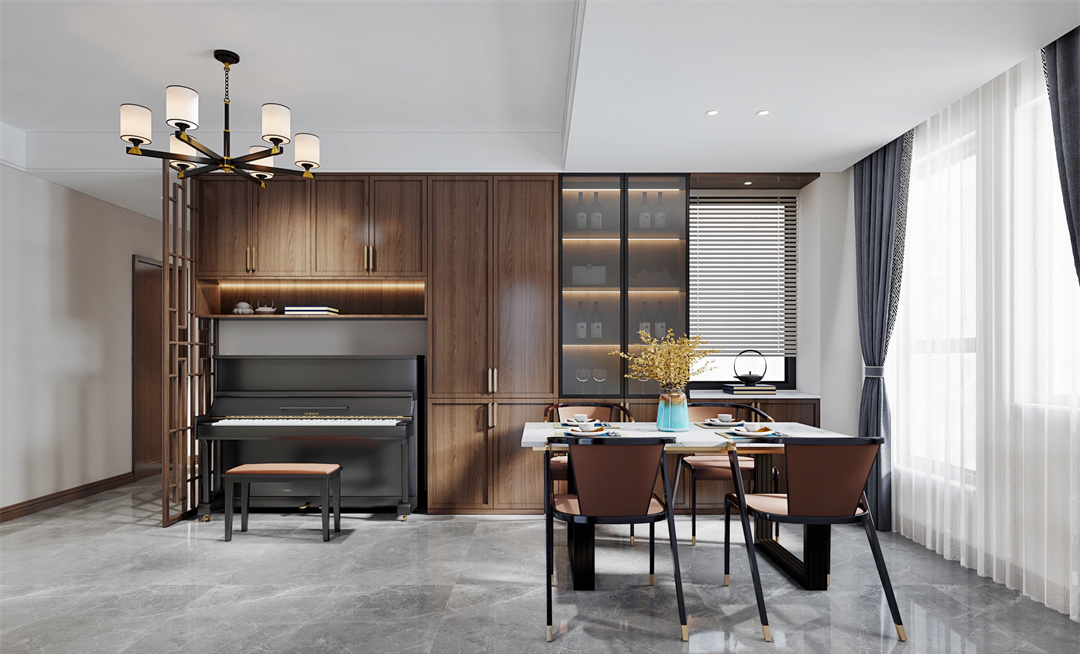 餐廳和鋼琴區(qū)利用儲(chǔ)物柜的功能劃分,以及屏風(fēng)隔斷的運(yùn)用,增加整個(gè)空間的美感。