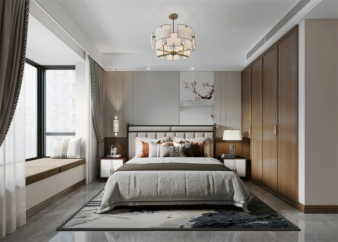 主臥以咖色為主色調(diào),床頭背景墻采用臘梅軟包,彰顯空間柔中帶剛的性情。衣柜做了鏤空處理,避免開(kāi)合柜門(mén)碰撞的現(xiàn)象。