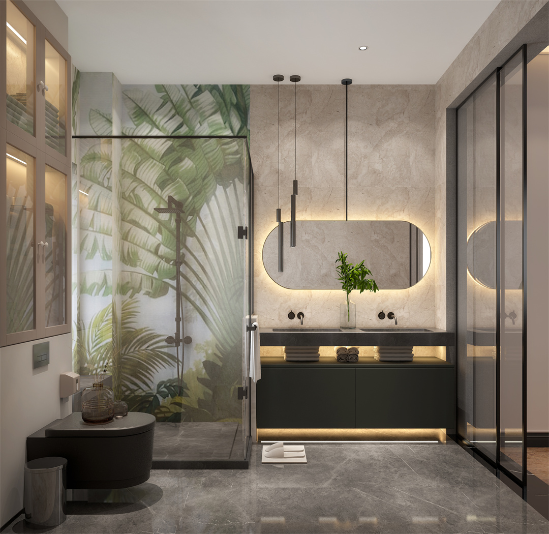衛(wèi)生間沒有選擇安裝柜式鏡子,而是安裝了LED鏡子,自帶燈光,并且有加熱除霧功能,顏值很高。