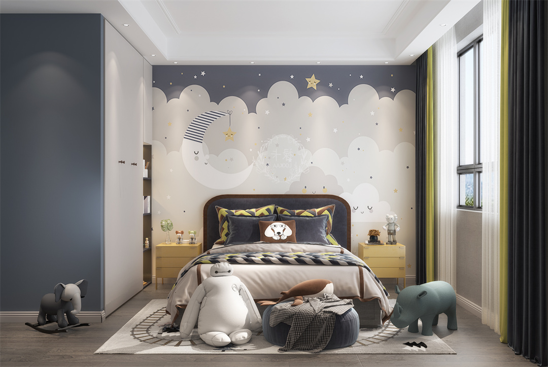 兒童房的主要功能是睡眠和娛樂,此外還設(shè)有儲藏空間。兒童房的設(shè)計是依據(jù)兒童心理和年齡的特點,根據(jù)其個性和日常活動等布置,在細節(jié)上下工夫,為兒童創(chuàng)造一個溫馨、舒適、富有趣味的小天地。