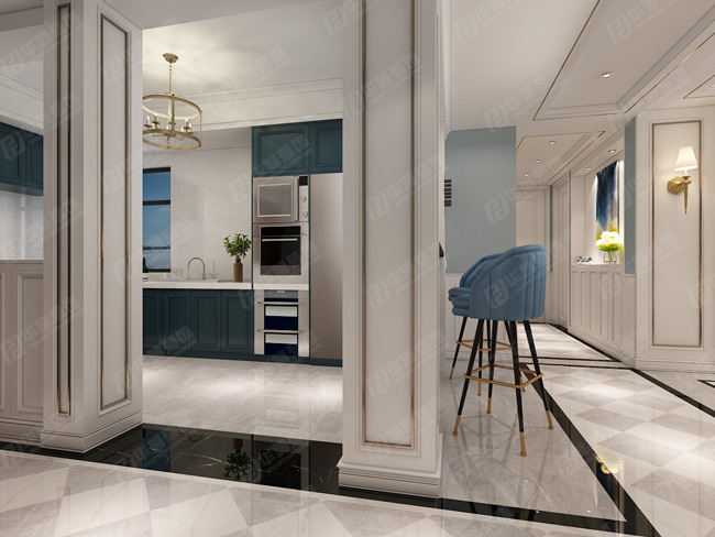 客廳相隔走廊就是餐廚空間,全房吊頂,金屬線條+護(hù)墻板造型墻面,給人很干凈清爽的感覺。