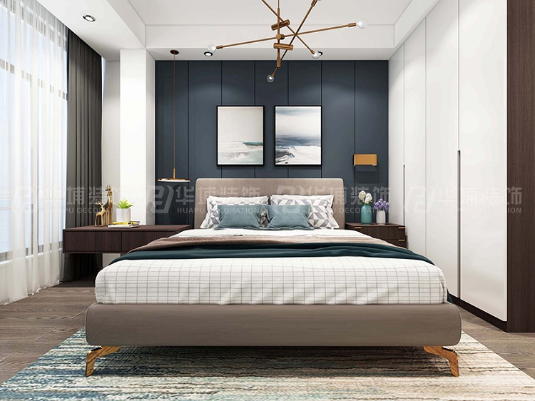 臥室部分一改大面積的灰色背景,用純凈白色做主打色,在加上些許的金屬色與咖啡色,床頭藍灰色硬包,剛?cè)岵?,表達出不一樣的輕奢氣質(zhì)。