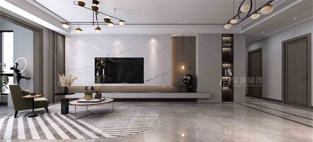 地面走撥打線呼應頂面造型,整體感十足。電視背景用整面石材設計,加以護墻板跳色。電視柜采用懸空設計,后期更加方便打理衛(wèi)生。整個電視背景7米長處理后協(xié)調(diào),美觀。整體裝修簡約大氣。