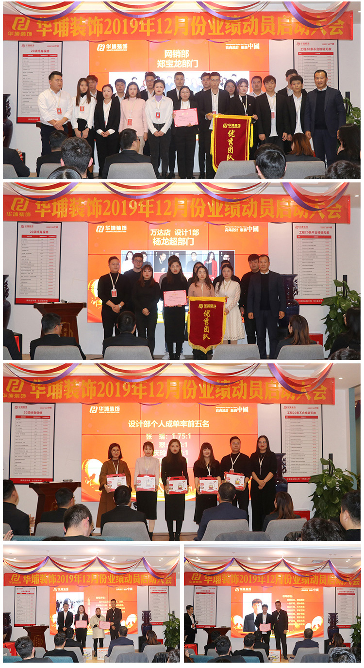 2019年12月4日下午,華埔裝飾十一月份業(yè)績(jī)表彰、十二月份動(dòng)員大會(huì)在華埔裝飾(航海路旗艦店)三樓會(huì)議大廳舉行。華埔裝飾董事長(zhǎng)張革命提出,服務(wù)和客戶滿意度依然是我們今后工作的重中之重,我們要用心維護(hù)客戶,用產(chǎn)品和服務(wù)打動(dòng)客戶,把客戶當(dāng)作最親密的朋友對(duì)待。臨近年底,希望各位同事們要給自己樹立好目標(biāo),有志者才能事竟成,用自己的成績(jī)回饋家人,給自己的2019年交一份滿意的答卷。