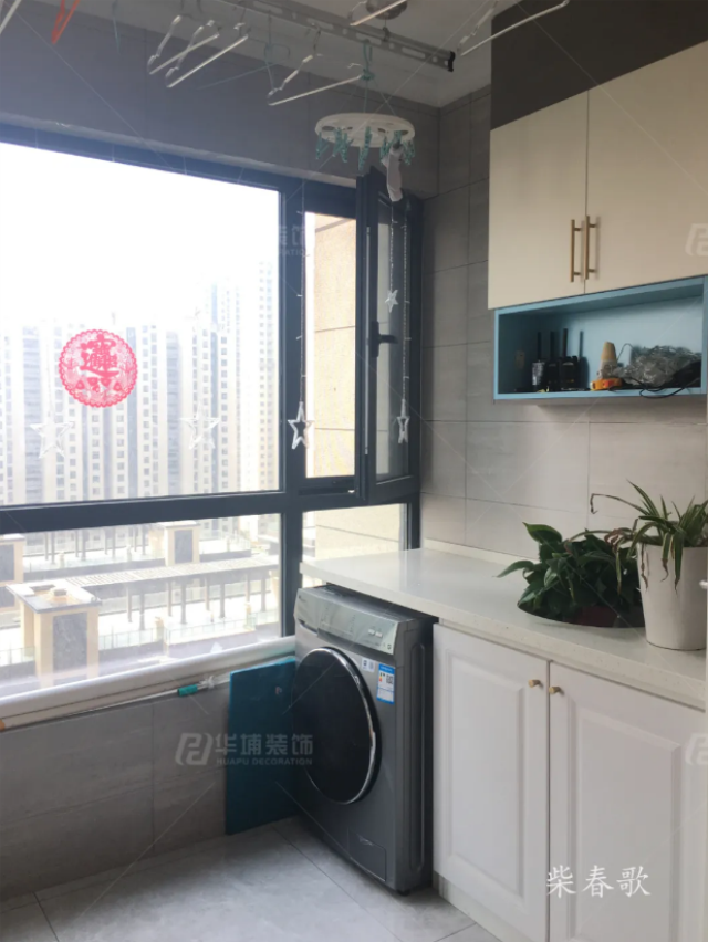 陽(yáng)臺(tái)主要用作生活,洗衣機(jī)+吊柜+洗手臺(tái)的常規(guī)設(shè)計(jì),將生活的小溫馨承載。