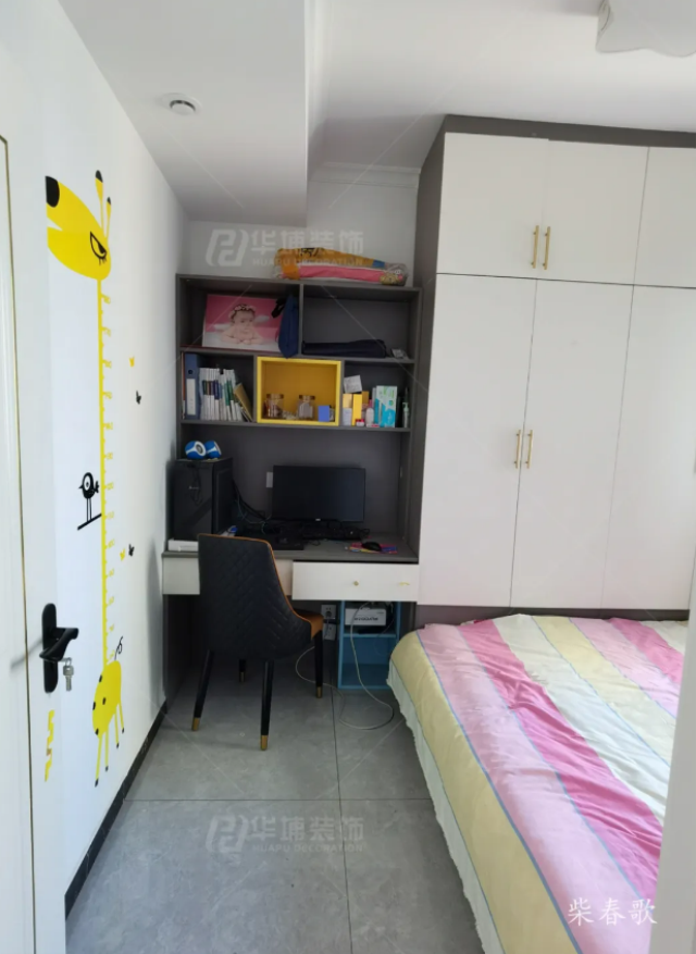 女兒房做了榻榻米+衣柜+書桌柜的組合,孩子現(xiàn)在還小,暫時(shí)還可以用作書房。墻面黃色的量尺區(qū)還是非常惹眼的,可以記錄小朋友的成長(zhǎng),也是很有愛的設(shè)計(jì)。