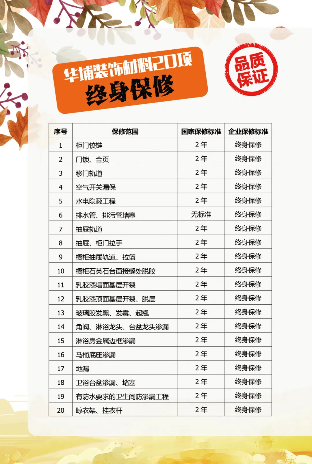 20項終身保修,解決你入住后的各種小麻煩。