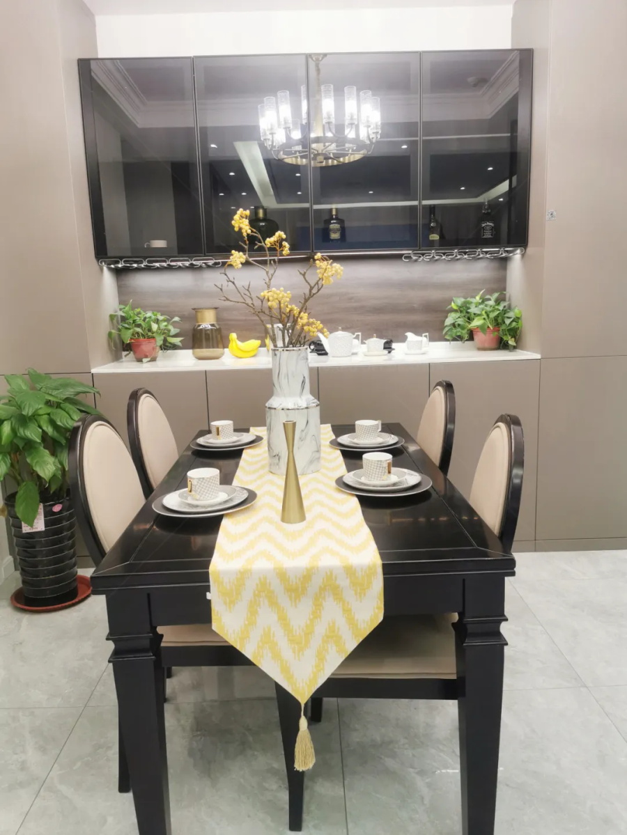 入戶門廳直接把鞋柜和餐邊柜結(jié)合,這樣比較節(jié)省空間,同時(shí)還滿足鞋子、包包等的收納。餐邊柜做了一個(gè)分體,上邊是酒柜,小酌怡情;下邊是平開柜子,無論是做鞋柜或是廚房電器的收納,都很不錯。