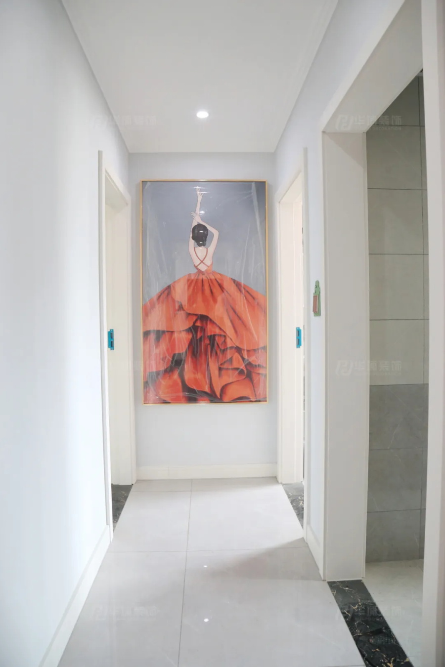 這是一個(gè)沒(méi)有玄關(guān)的戶型,入戶正對(duì)走廊端景,一幅掛畫(huà)長(zhǎng)裙散開(kāi),折纖腰以微步,舞者高貴的美,瞬間奠定整個(gè)空間輕如風(fēng)、猶碧玉的品質(zhì)。