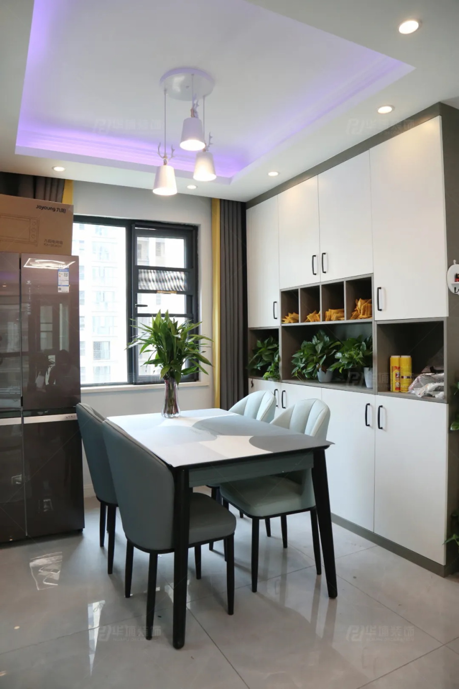 餐廳是青灰色,線條型餐桌椅,現(xiàn)代化質(zhì)感,簡(jiǎn)單愉悅的用餐生活。