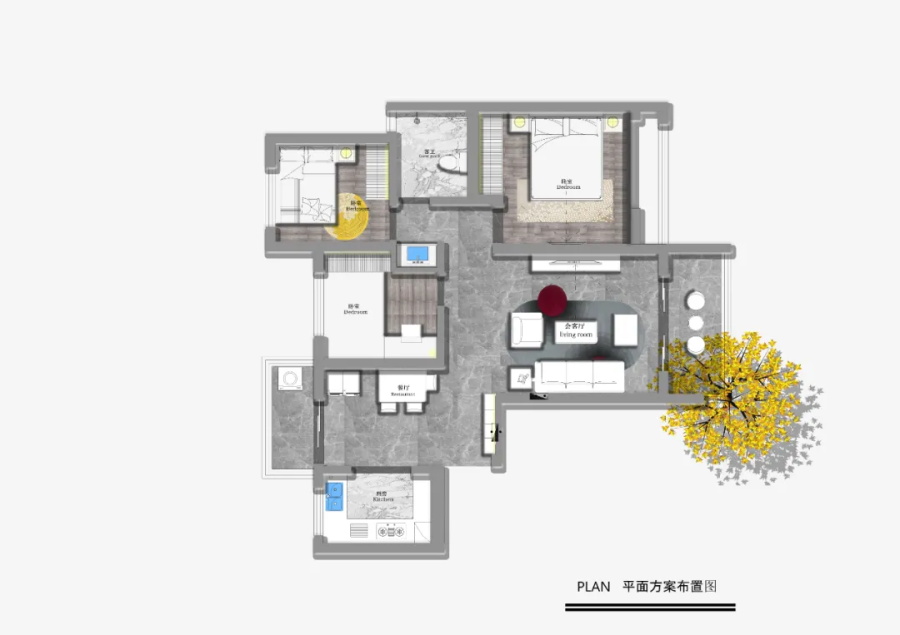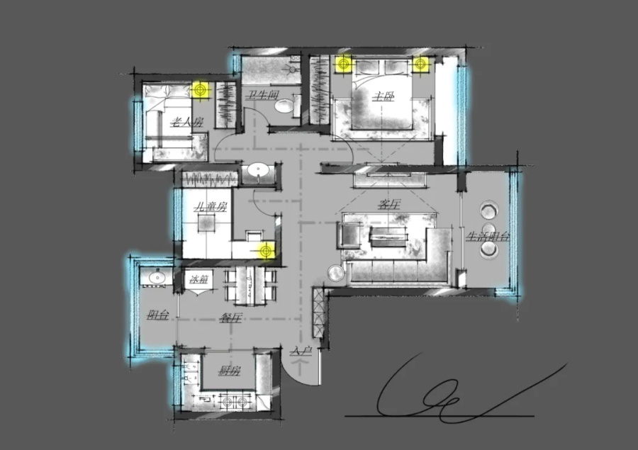 由于原始戶型存在通風差、采光不足的問題,設計師做了局部改造:(1)原戶型中兒童房門與衛(wèi)生間門正對,影響兒童房的采光與通風,設計師將原兒童房門封掉,開在了客廳朝向,將客廳的采光與通風引入;(2)衛(wèi)生間做了干濕分離,方便一家人后期的使用。