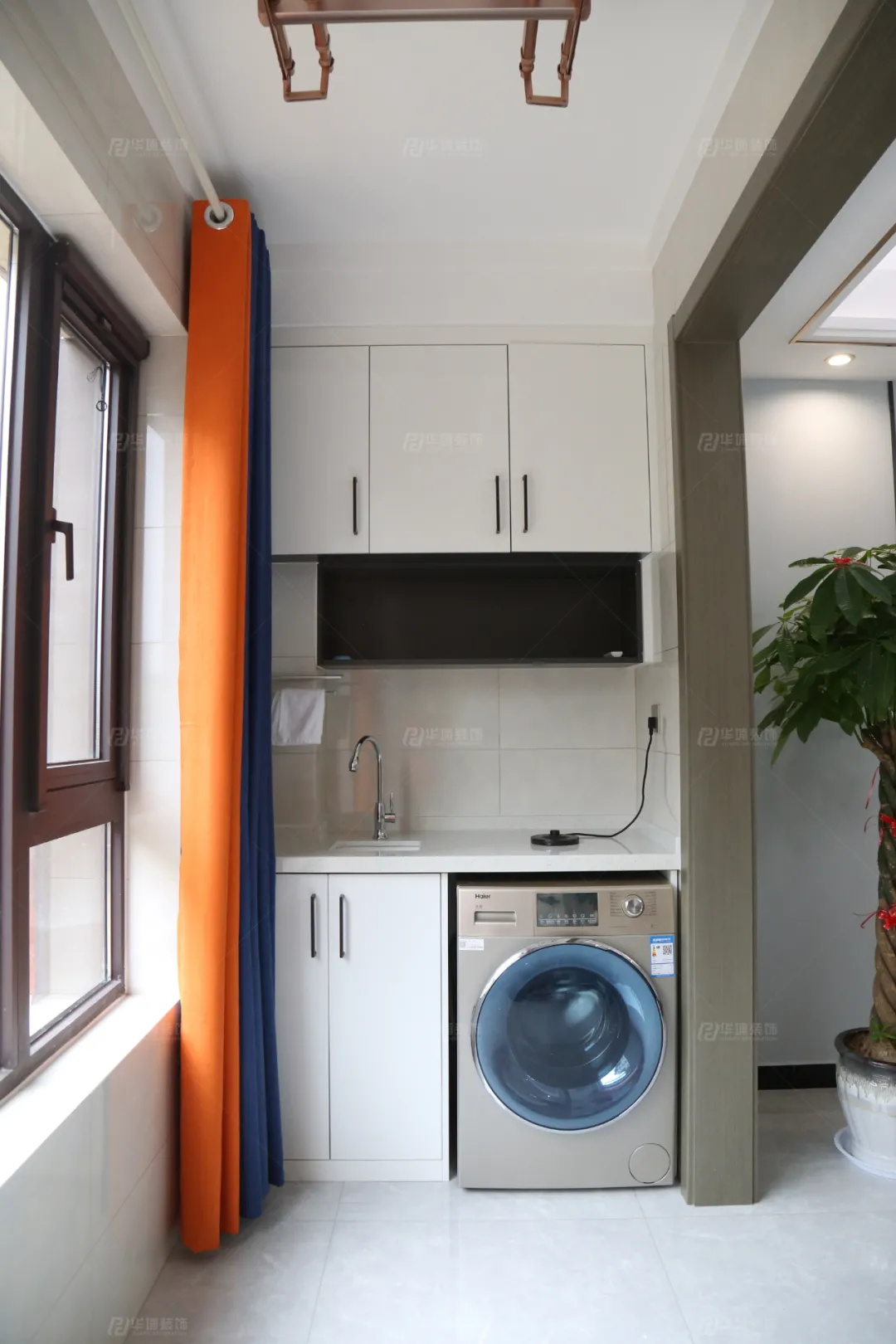 客廳以“即簡即奢”作為設(shè)計(jì)理念,整體配色統(tǒng)一,包括乳膠漆、護(hù)墻板、地磚、吊頂,頂?shù)睾弦唬尸F(xiàn)了一個(gè)光潔通透的大視角空間。陽臺(tái)作為生活區(qū),以吊柜+地柜+洗衣機(jī)+洗手臺(tái)做陳設(shè),滿滿的實(shí)用。