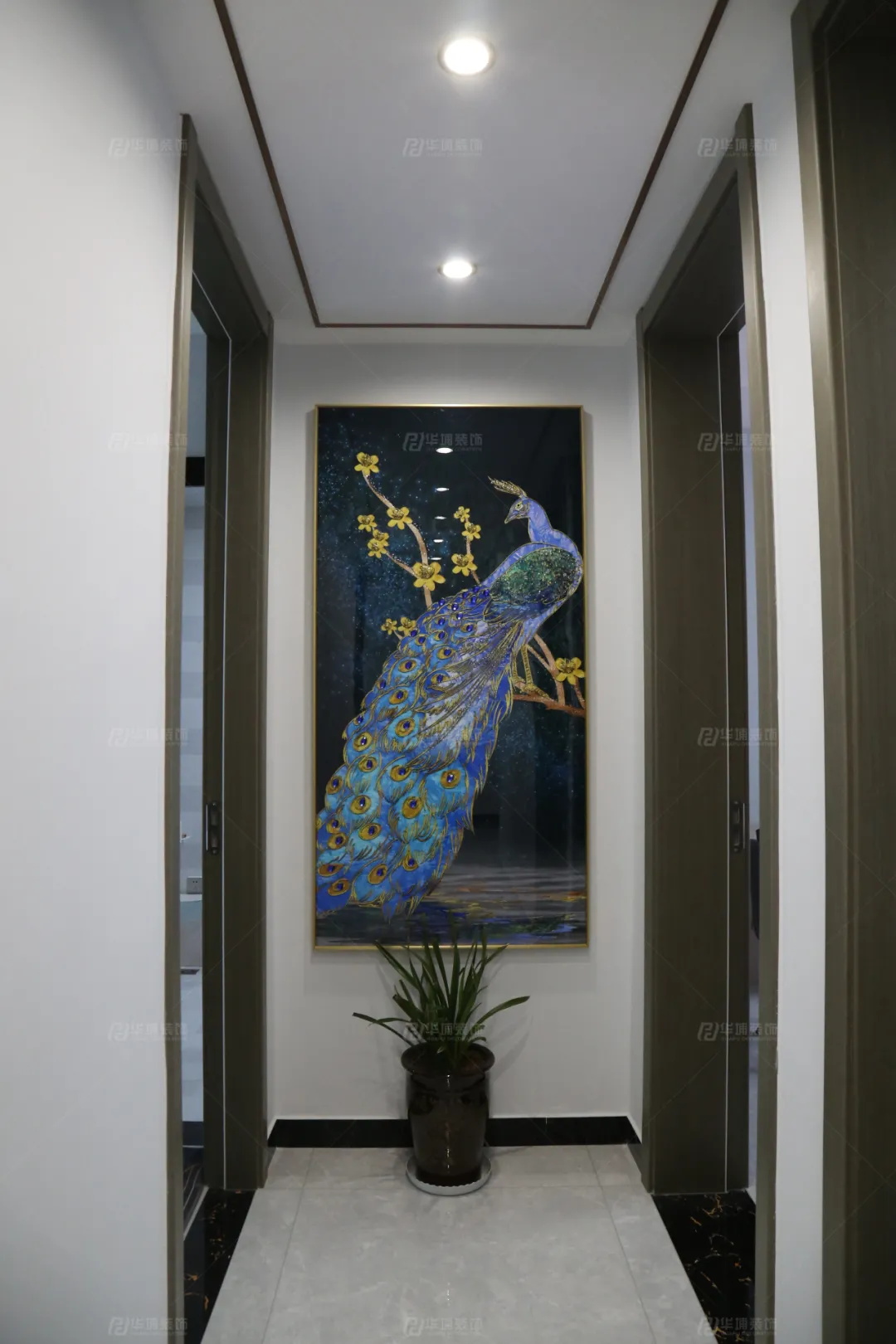 孔雀作為一種吉祥鳥,經(jīng)常入畫出現(xiàn)在居室內(nèi)。設(shè)計(jì)師以孔雀作為端景畫裝飾,一是祝福前程似錦,二是祝愿吉祥如意。