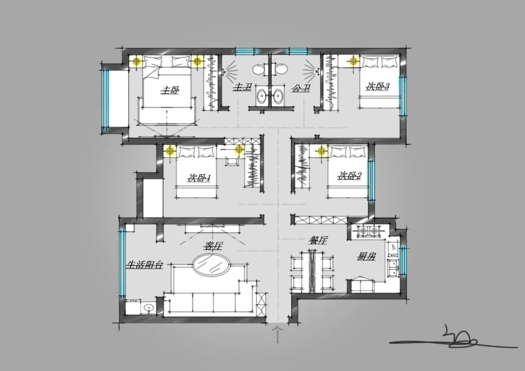 這是一套126平四房,由于原始戶型存在缺陷,導(dǎo)致采光、通風(fēng)、儲物不足,設(shè)計師做了局部改造,形成了一個南北通透、中心對稱的空間布局。