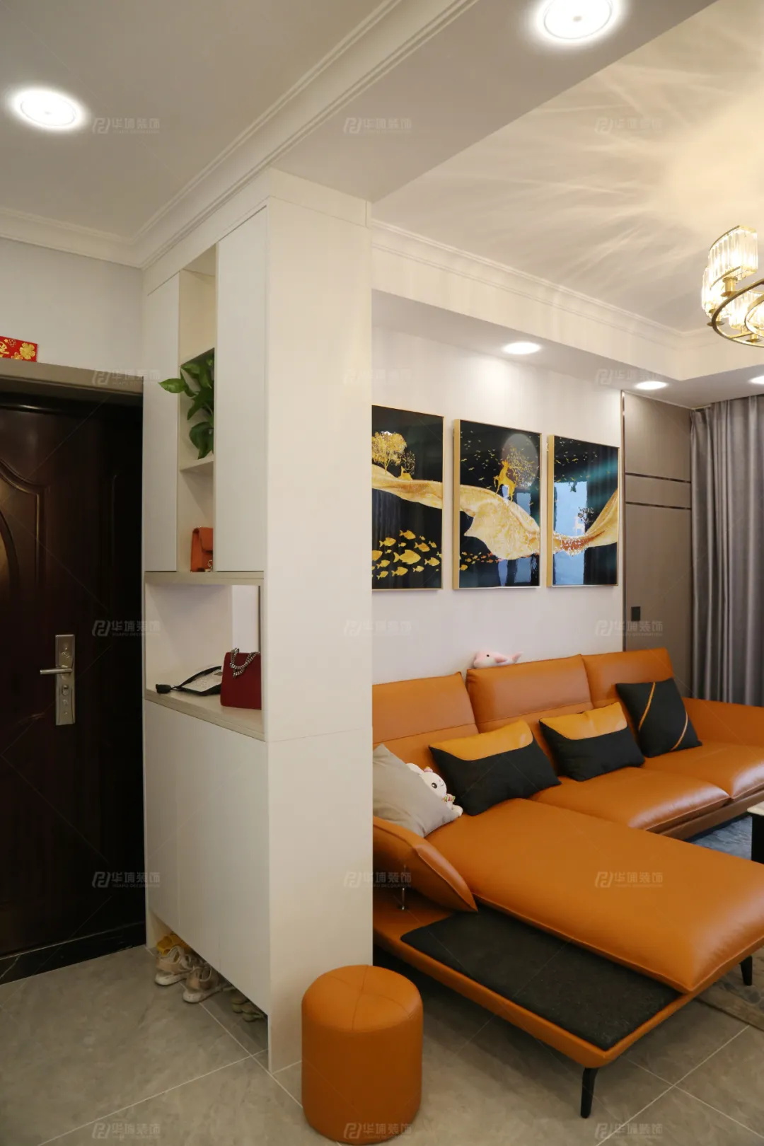 入戶右側(cè)新建柜子做玄關(guān),增加收納的同時,保護會客隱私。為了保持空間整體性,設(shè)計師在柜子外側(cè)做上石膏板刷飾乳膠漆,增加美觀度。