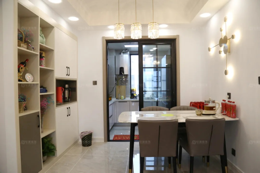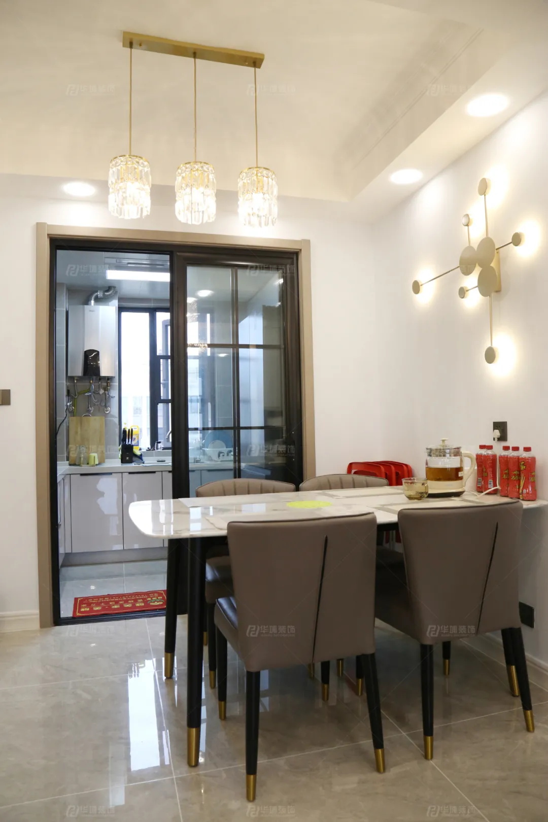 餐廳的光感很強,水晶吊燈+幾何壁燈,營造了一個浪漫溫馨的用餐氛圍。除了線條感的餐桌椅,還有整墻的餐邊柜以及展示柜,滿天星+紅酒,與君共天明。