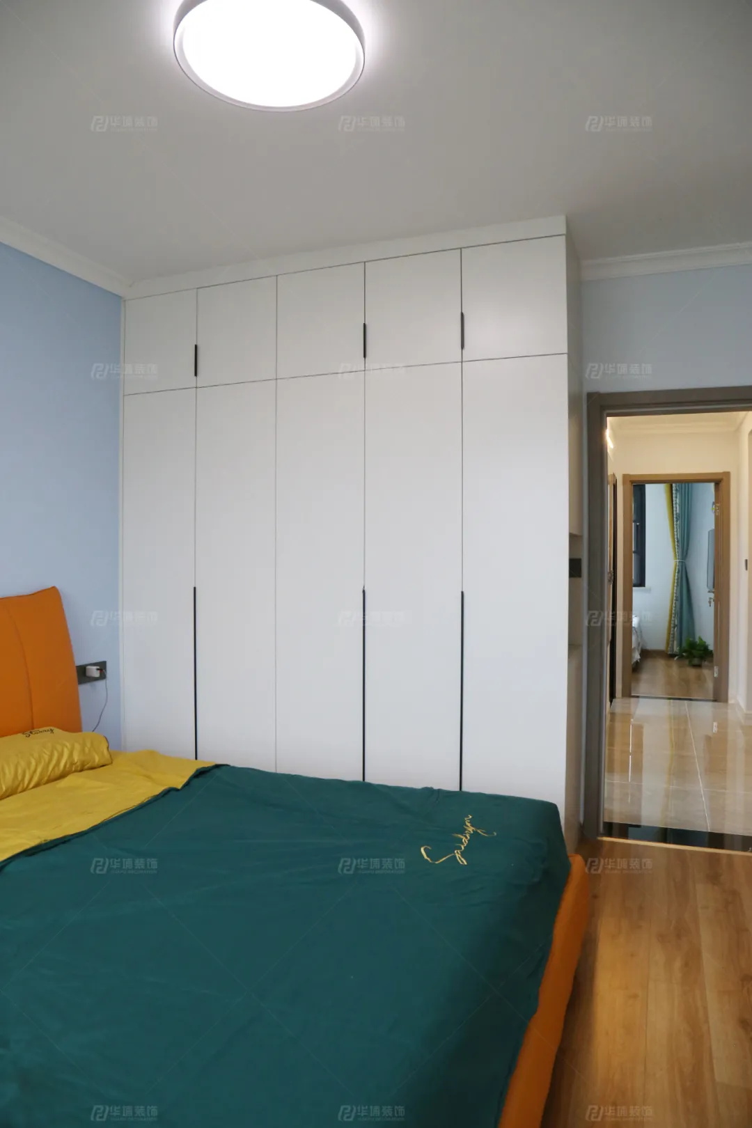 影影綽綽,皆是麗人。主臥的配色很時尚,恬淡的藍(lán)、飽和的綠、愛馬仕橙加上米黃灰,豐富的色彩,層次感空間,好溫馨。