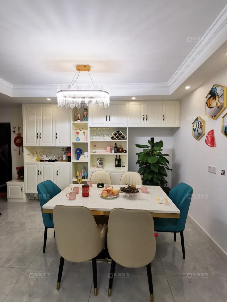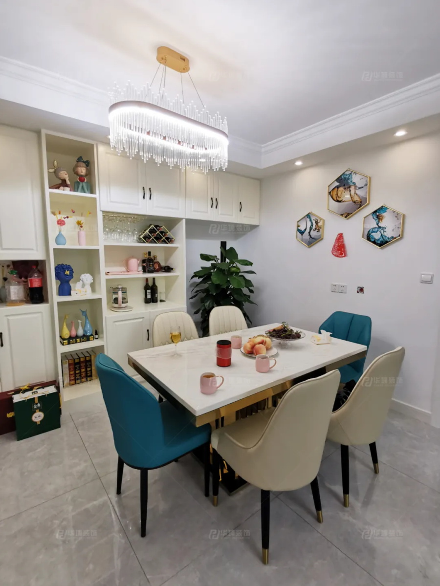 業(yè)主是一家三口,但是女主的姐姐和弟弟都在同一小區(qū),經(jīng)常團聚,所以餐廳做成了六人位設計,一家人團坐用餐,滿滿的幸福感。餐椅是做了撞色,米色+寶石藍,華麗的視覺,滿目溫馨。餐邊柜做了入戶一面墻,鞋柜和酒柜合體,開放格做展示,將生活的實用性鋪滿空間。