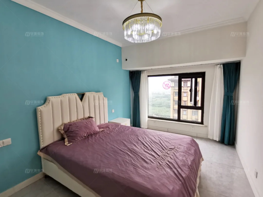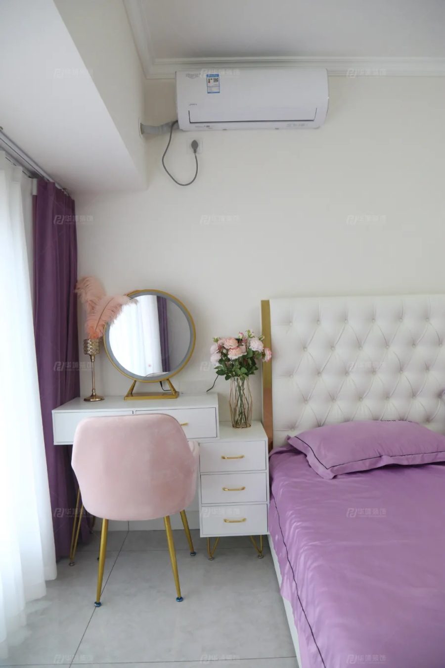 主臥用乳白色做空間鋪陳,香芋紫窗簾和床品,茱萸粉化妝凳,通過顏色的對比融合,來營造高貴浪漫的既視感。