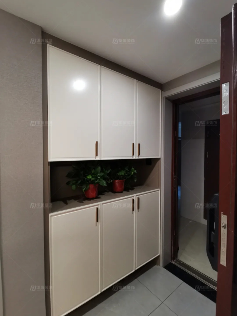 入戶是常規(guī)的三段式鞋柜,中部留空、底部懸空,這樣比較方便后期的使用。整個(gè)玄關(guān)柜是內(nèi)嵌設(shè)計(jì),青灰色墻體、胡桃木材質(zhì)、白色的柜體,色彩的搭配簡單素雅但又層次分明,很舒服。