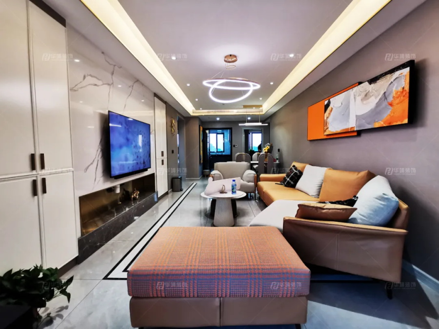 客廳以莫蘭迪著色,灰咖的大環(huán)境下以愛馬仕橙掛畫點(diǎn)綴,起到點(diǎn)睛、跳躍的視覺效果。電視墻是兩側(cè)內(nèi)嵌柜體,中間以爵士白石材+鏤空的石臺(tái)做的造型,很有立體感。沙發(fā)背景通鋪到餐廳,保持了空間的整體性,很開闊。