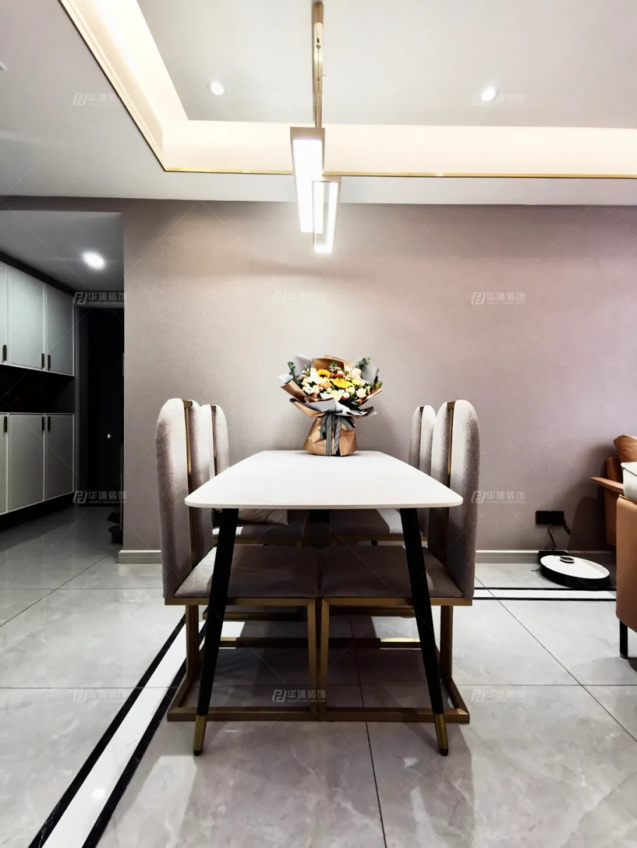 餐廳是質(zhì)感與品位的彰顯,純色的墻面,巖板餐桌,搭配立體感很強(qiáng)的金屬線條餐椅,讓輕奢“言而有物”。