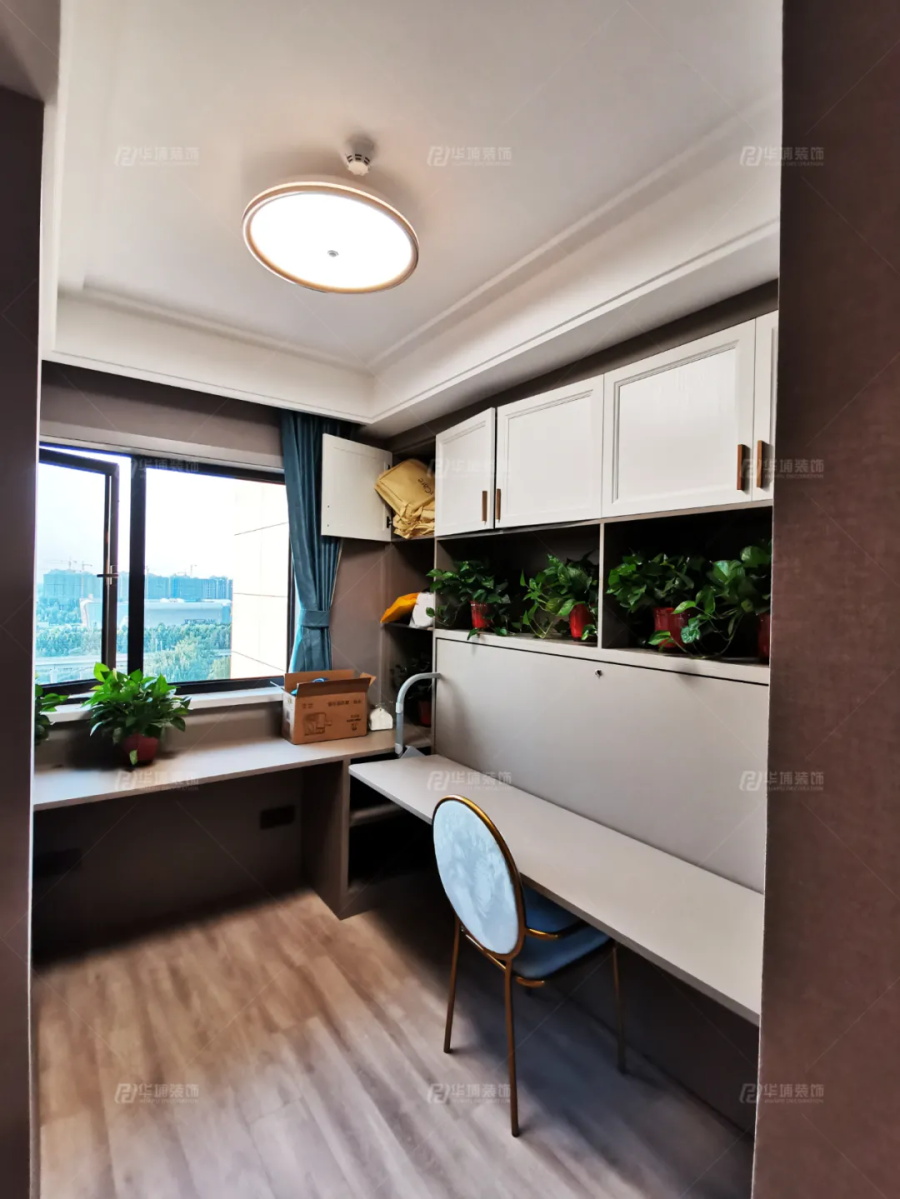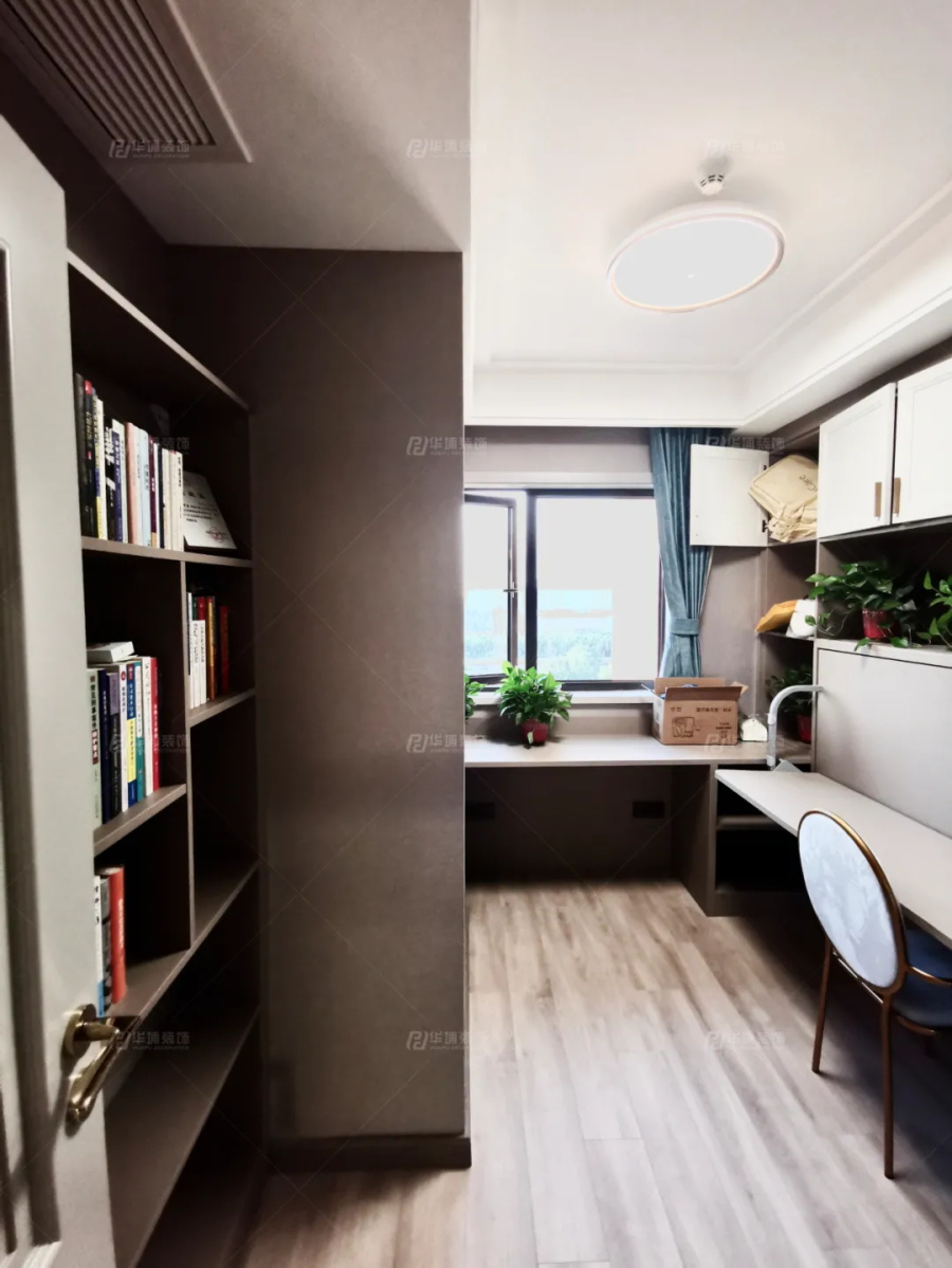 書房做了很多柜體,內(nèi)含隱形床兼容臥室。一方小小的空間,承載了強(qiáng)大的儲(chǔ)物功能,也是厲害。